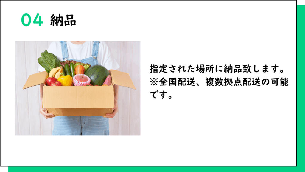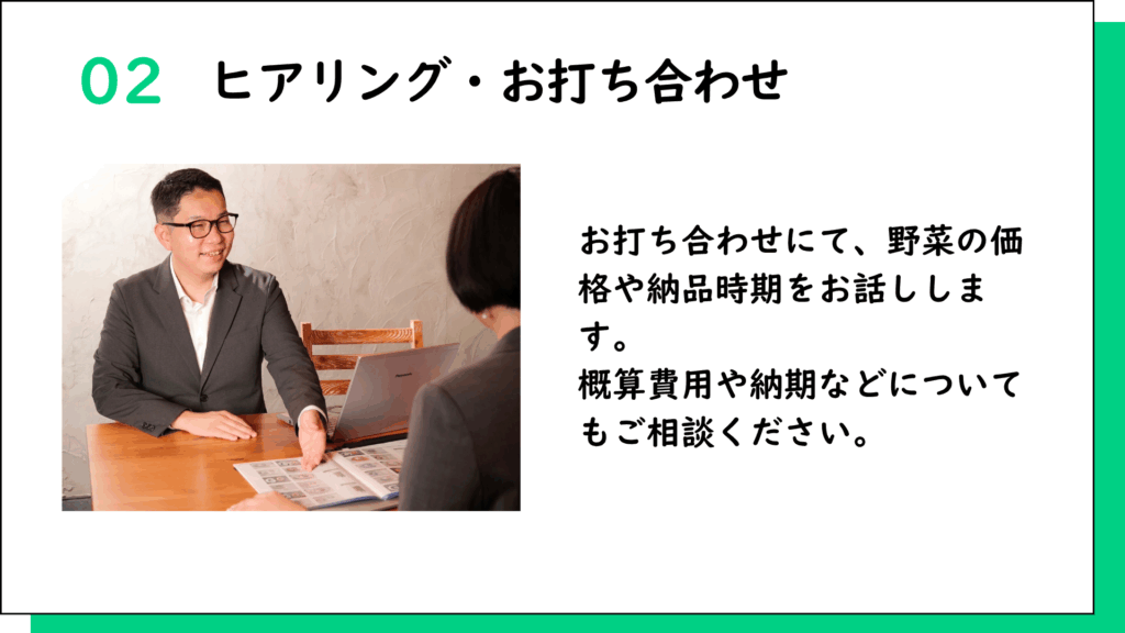 受注フロー よくあるご質問(FAQ) 配送エリア・配送日の指定は可能ですか?また、複数拠点への配送に対応していますか? 日本全国のお客様に対応が可能です。配送日のご指定も可能です。 食品メーカーの仕入れ担当です。特定の野菜を大量に仕入れたいのですが、安定供給は可能でしょうか? 時期や状況によって異なりますため、ご相談くださいませ。 ご相談・お見積もりはこちらから